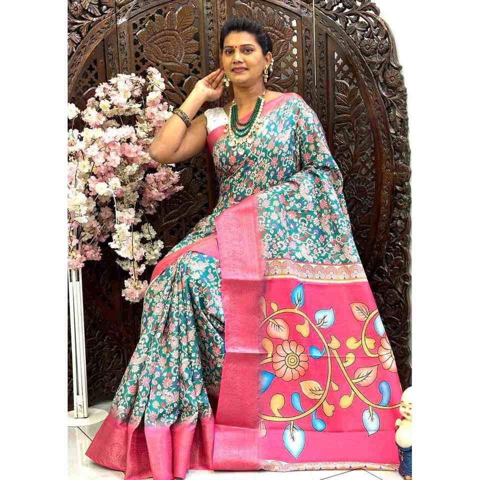 DISEÑADOR DOLA SEDA IMPRESIÓN DIGITAL KANJIWARAM FRONTERA TRABAJO SAREE CON BLUSA DESCOSADA VERDE MAR