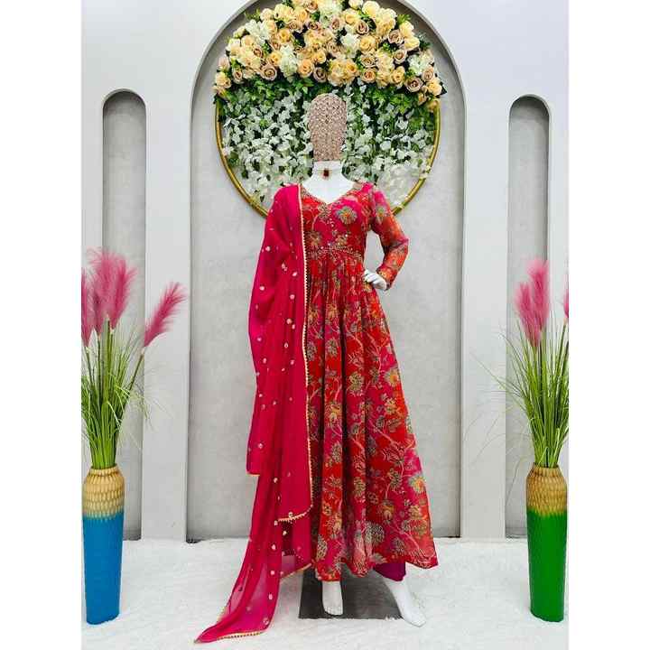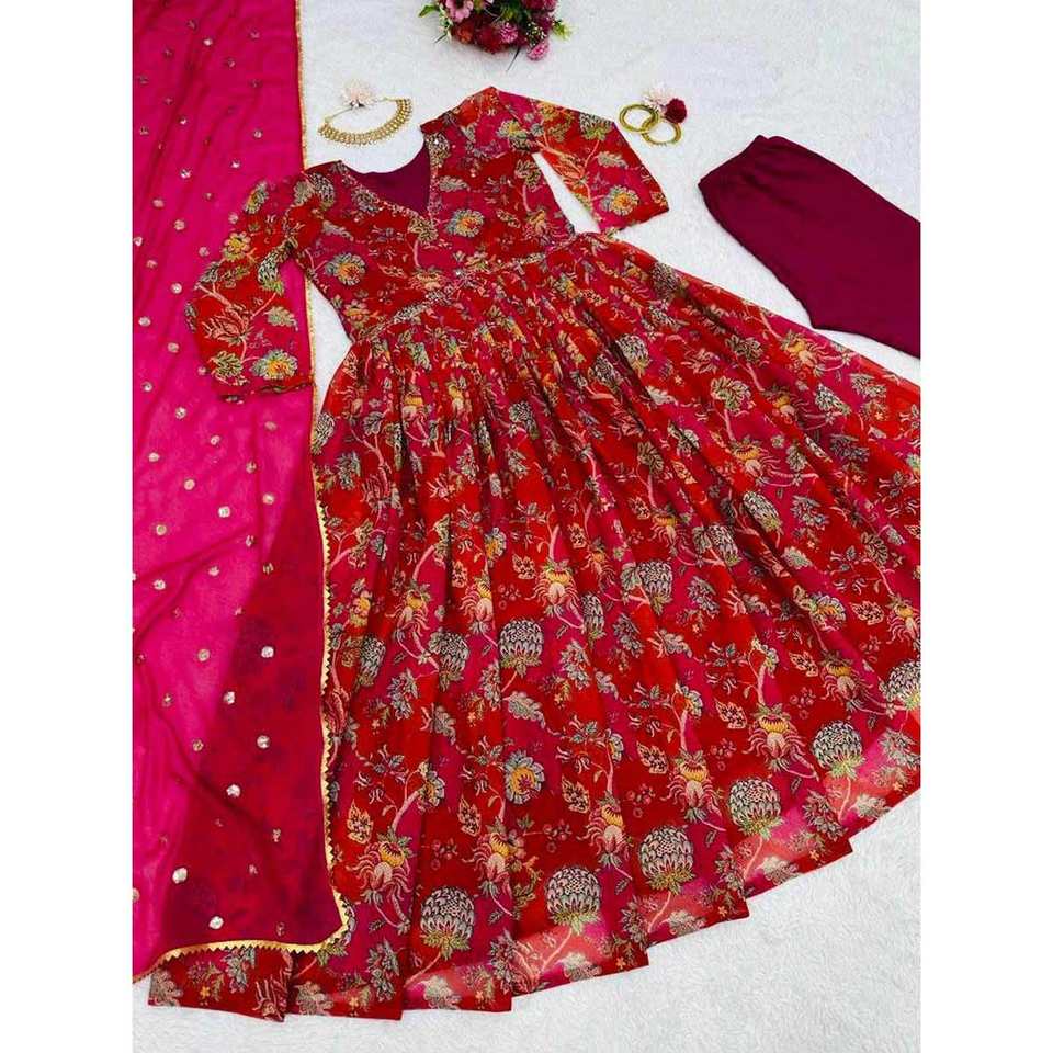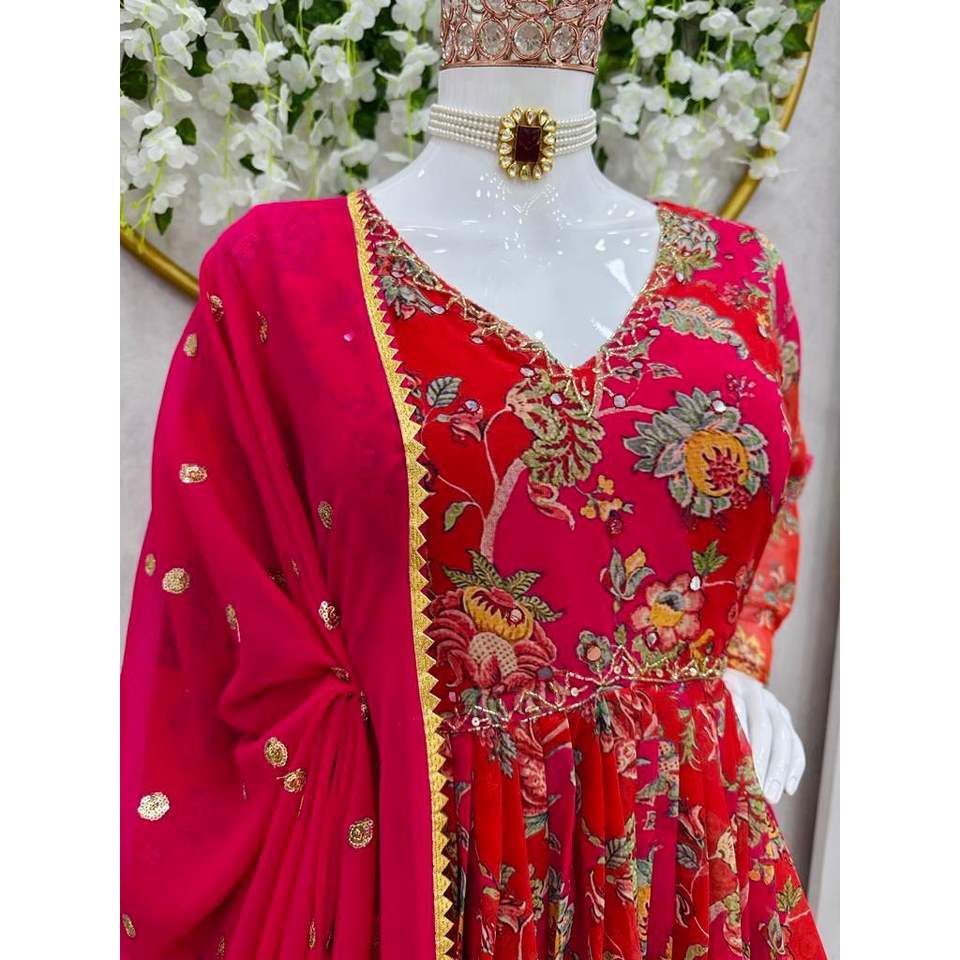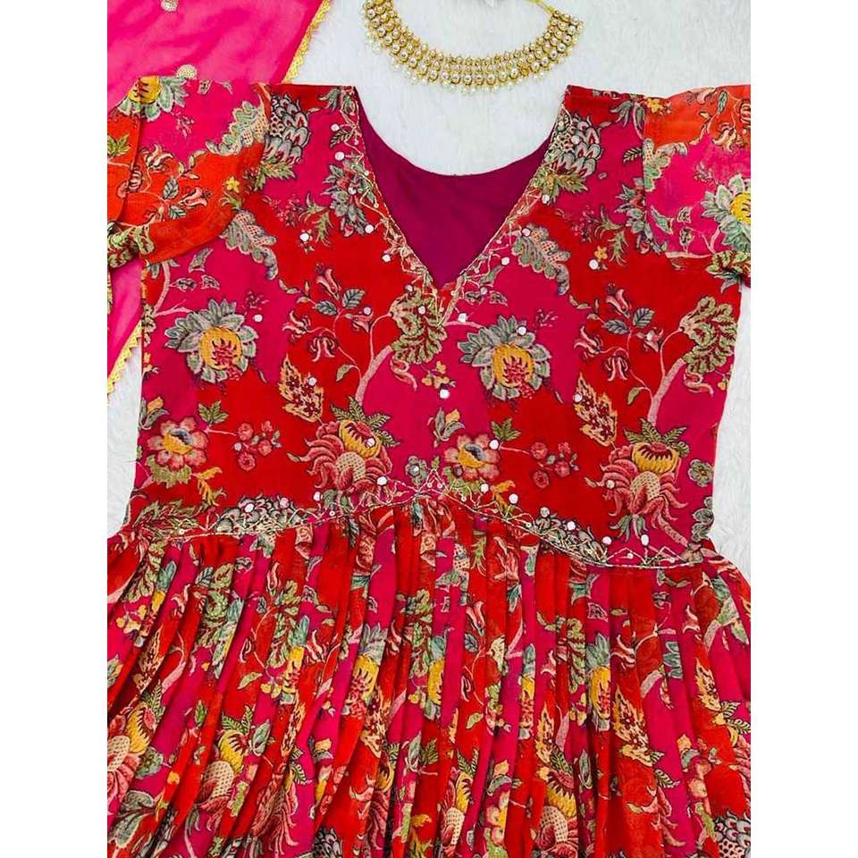 Vestido de Trabajo con Estampado Digital de Diseñador en Georgette con Dupatta Rojo