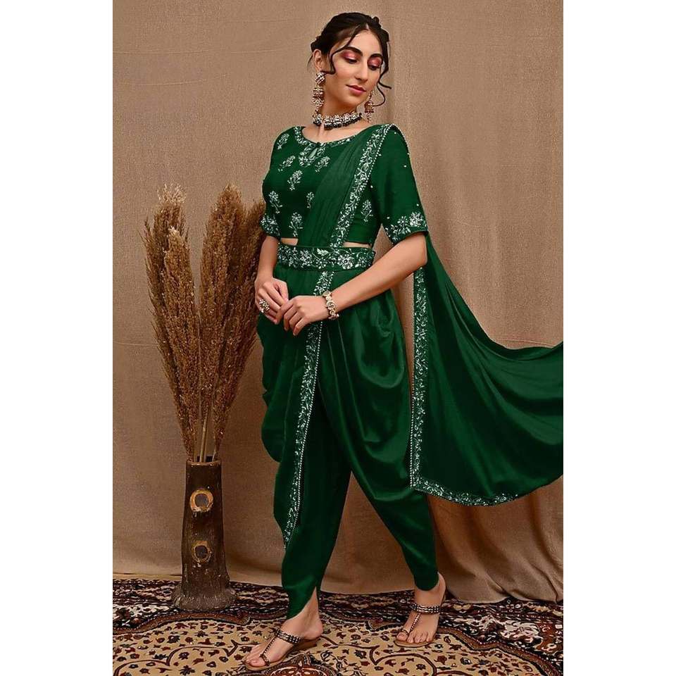 DISEÑADOR GEORGETTE BORDADO SECUENCIA TRABAJO READYMADE DHOTI BLUSA SIN COSTURA CON DUPATTA Y CINTURÓN VERDE