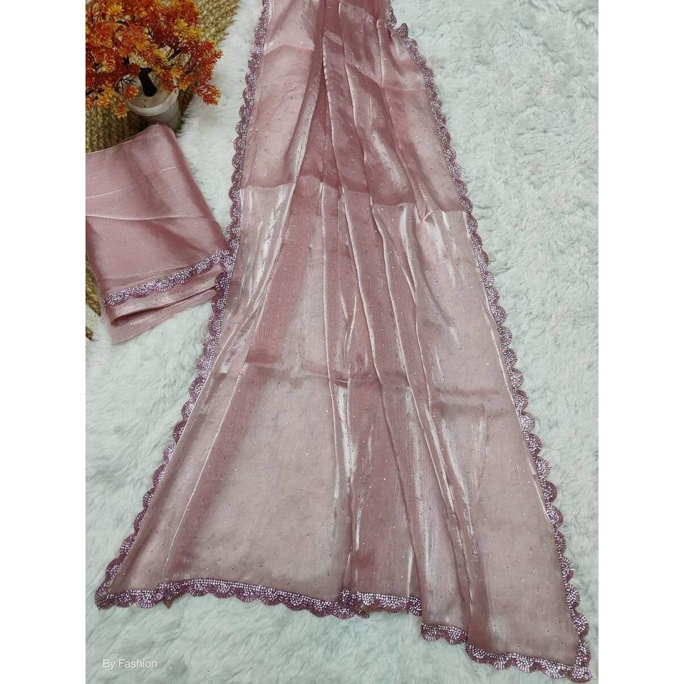 Sari de seda de diseñador con pedrería pesada y blusa sin coser, rosa bebé