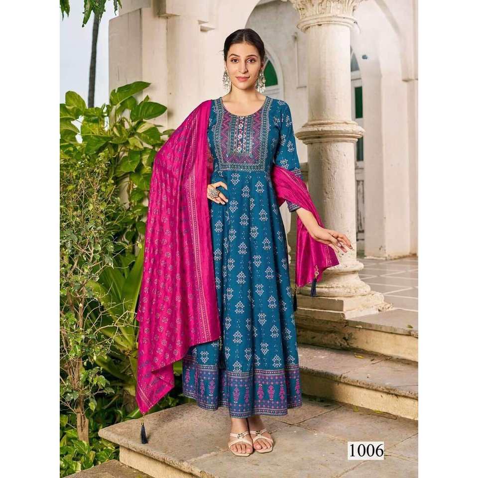 VESTIDO DE TRABAJO CON ESTAMPADO DE RAYÓN DE DISEÑADOR CON DUPATTA BLUE