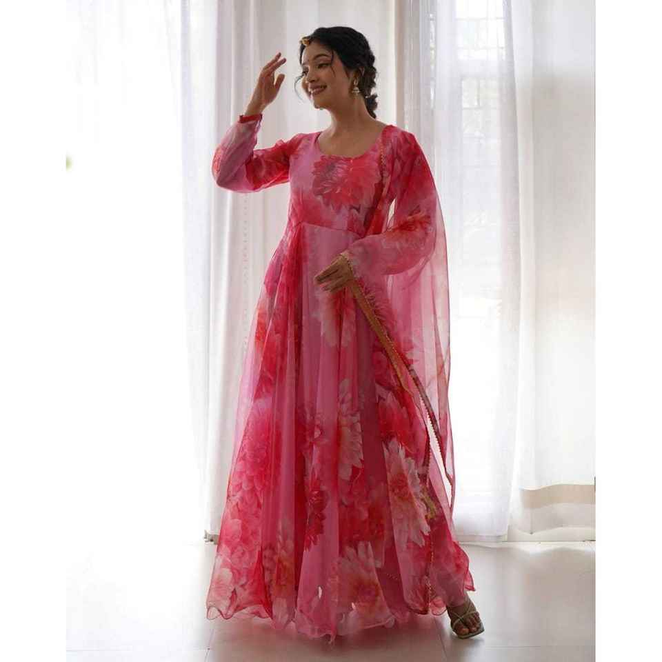 DISEÑADOR TUBBY ORGANZA BATA DE TRABAJO DE IMPRESIÓN DIGITAL CON DUPATTA ROSA
