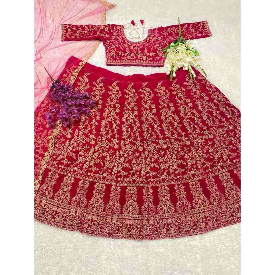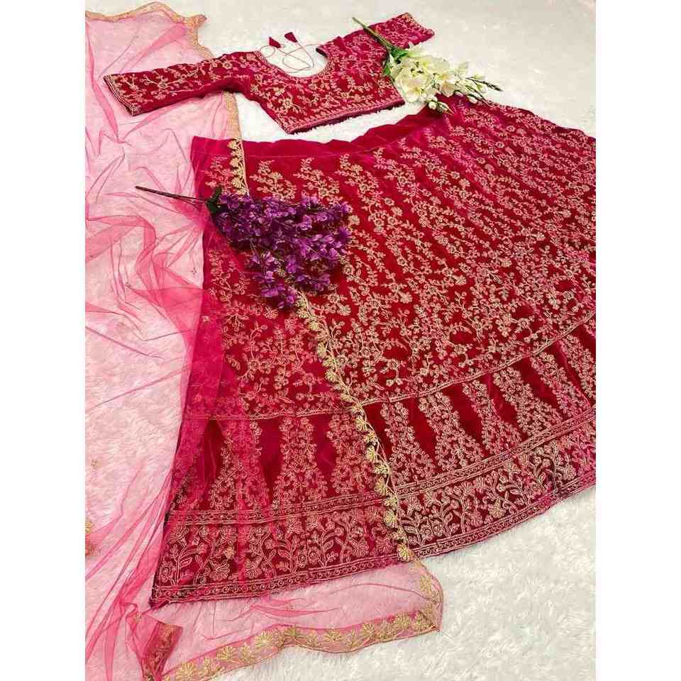 DISEÑADOR TERCIOPELO BORDADO CODIFICACIÓN TRABAJO LEHENGA CHOLI CON DUPATTA ROSA