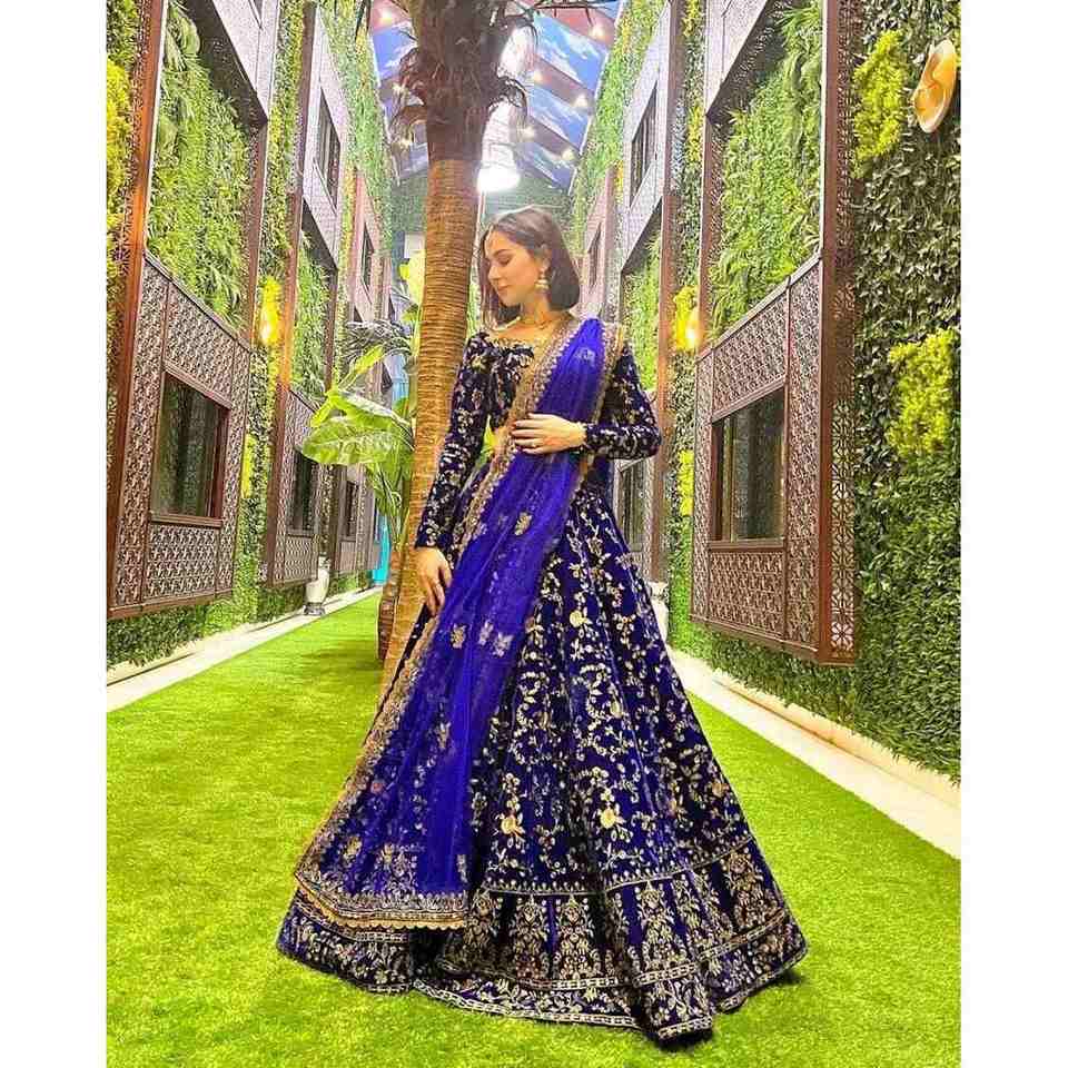 DISEÑADOR DE TERCIOPELO BORDADO CODIFICACIÓN TRABAJO LEHENGA CHOLI CON DUPATTA AZUL