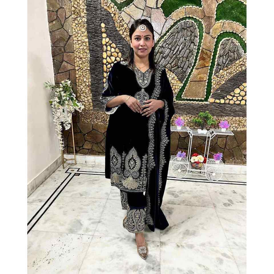 DISEÑADOR TERCIOPELO BORDADO SECUENCIA TRABAJO TOP BOTTOM CON DUPATTA NEGRO
