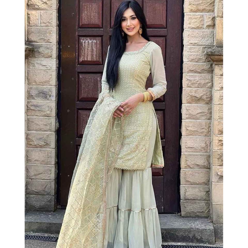 DESIGNER WEAR FIESTA LOOK FAUX GEORGETTE CON BORDADO TRABAJO TOP Y SHARARA LIGHT PISTA COLOR