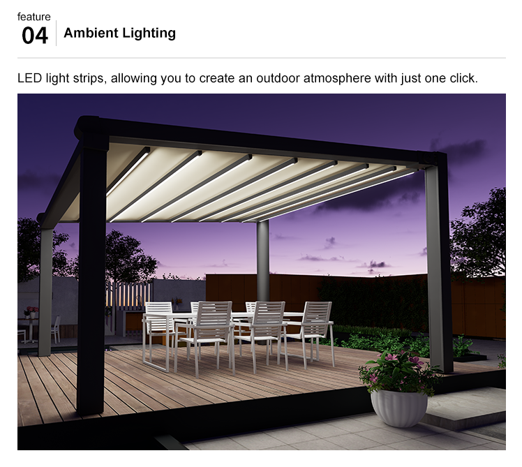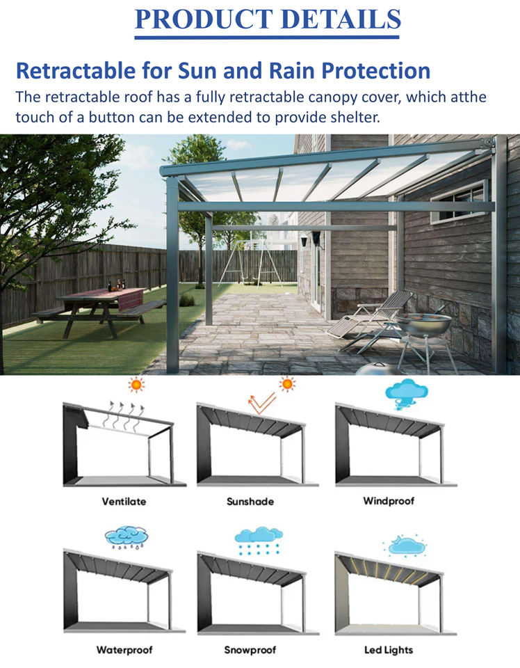 Aplicación:Jardín, Boda, Camping, Playa, Comercial, Al aire libre, Hotel, Patio trasero, Protección solar, Parasol, Toldo retractable, A prueba de agua, Eléctrico, Balcón, Dosel de lluvia, Decorativo, Protección contra la lluvia, Terraza, Cenador, Iluminación LED