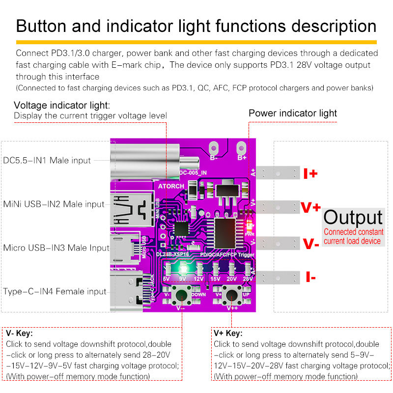 Functional features:Can trigger 5V/9V/12V/15V/20V/28V voltage
