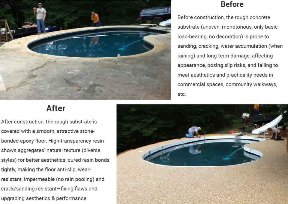 Alta transparencia: Muestra completamente el color y la textura naturales de los áridos de piedra, manteniendo un aspecto claro durante mucho tiempo sin amarillear ni enturbiarse.