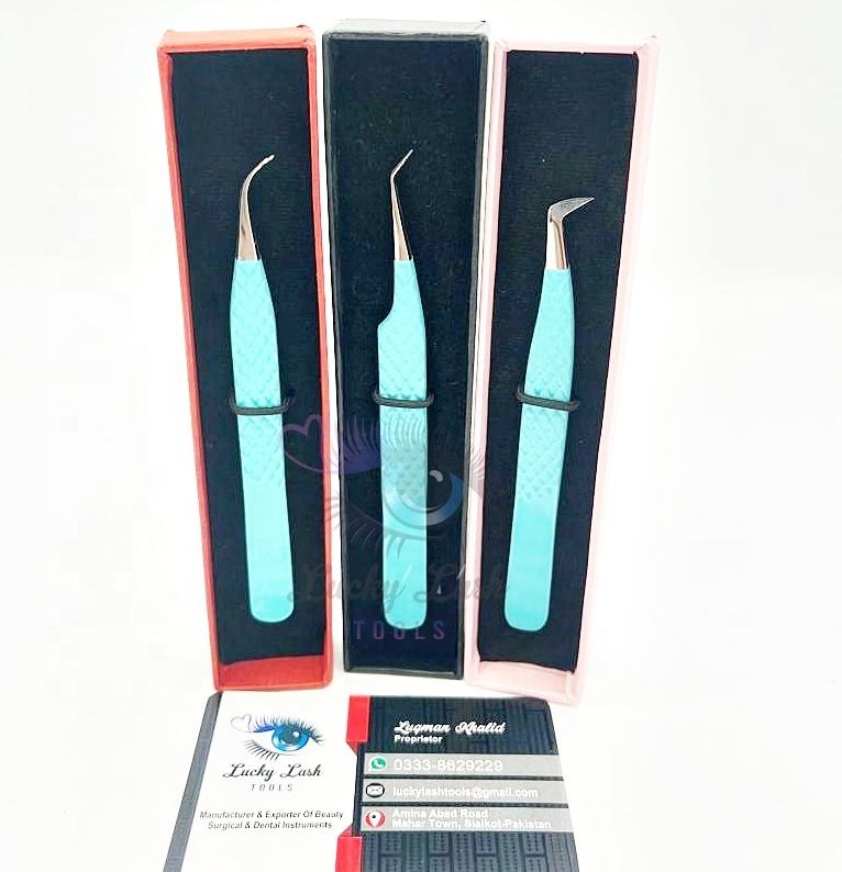 DT Light Blue Pinzas de extensión de pestañas de fibra de 75 grados Bota curva corta de acero inoxidable para aplicar cejas postizas puntiagudas