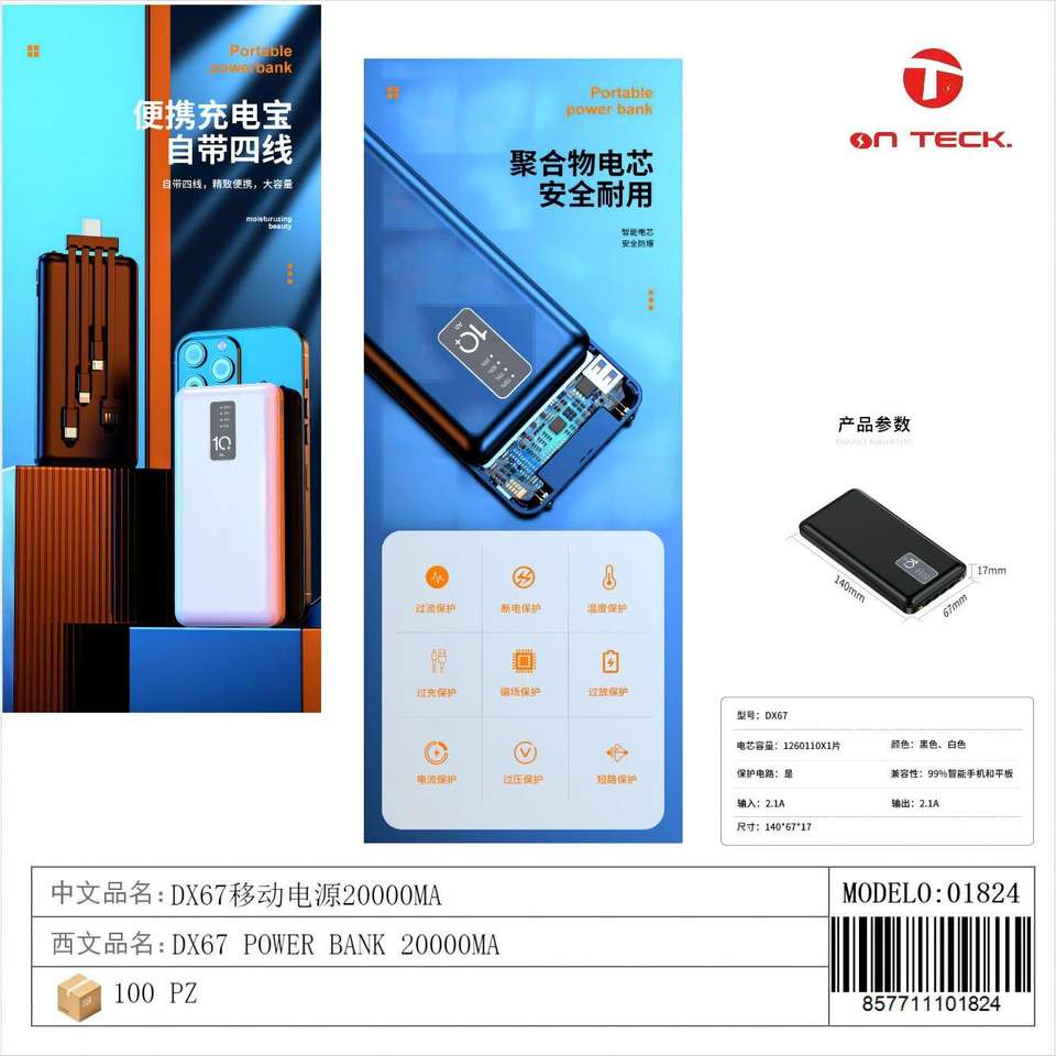 Batería Externa On Teck Sa De Cv de 20000 mAh con Carga Rápida Tipo C, Portátil, Ligera, Resistente, USB, para Viajes y Hogar 1824