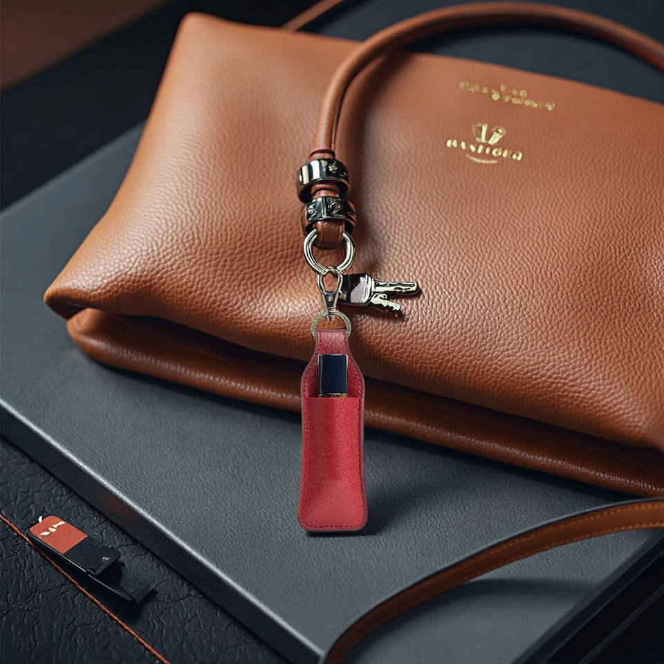 Estuche Portátil de Cuero PU para Lápiz Labial con Luz y Llavero, Organizador de Maquillaje Individual para Lápiz Labial