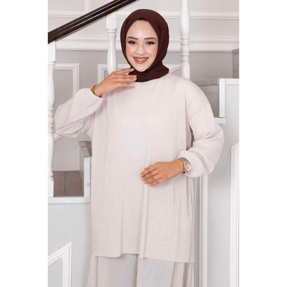 Conjunto Modesto de 2 Piezas para Hijab Diario con Cuello Redondo y Detalle de Piedras en Gris, Tallas 38-40/42-44, Hecho en Turquía