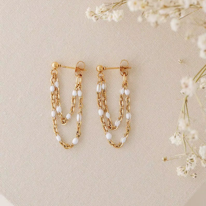 Pendientes Delicados de Doble Cadena con Perlas y Esmalte Blanco, con Cuentas Colgantes, Plata de Ley 925, Bañados en Oro de 14K, para Aniversario