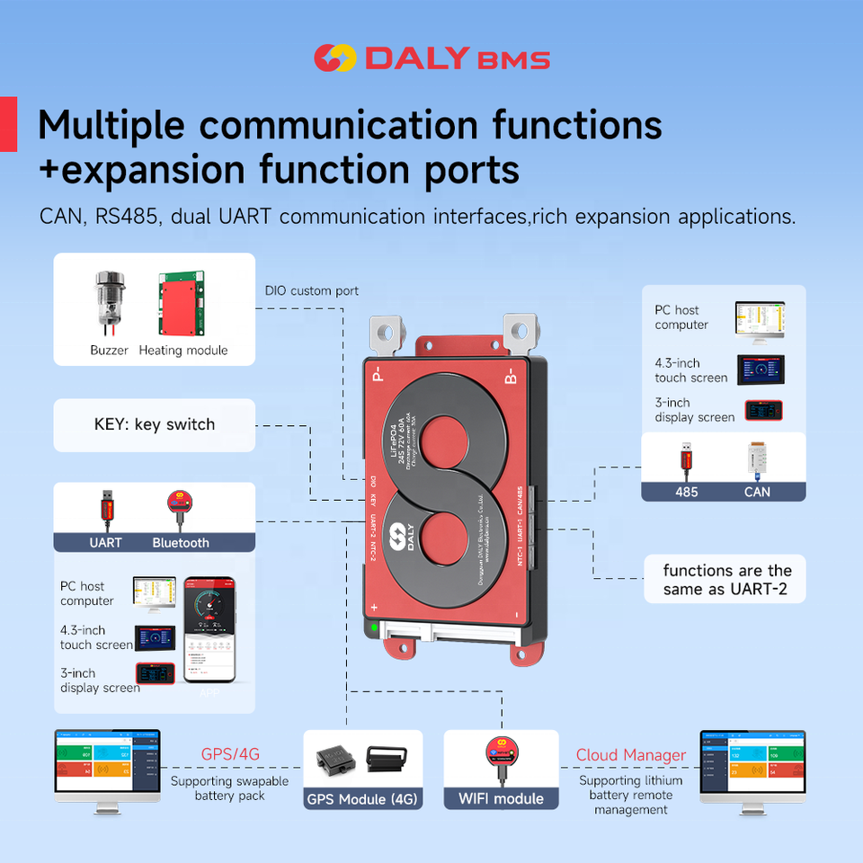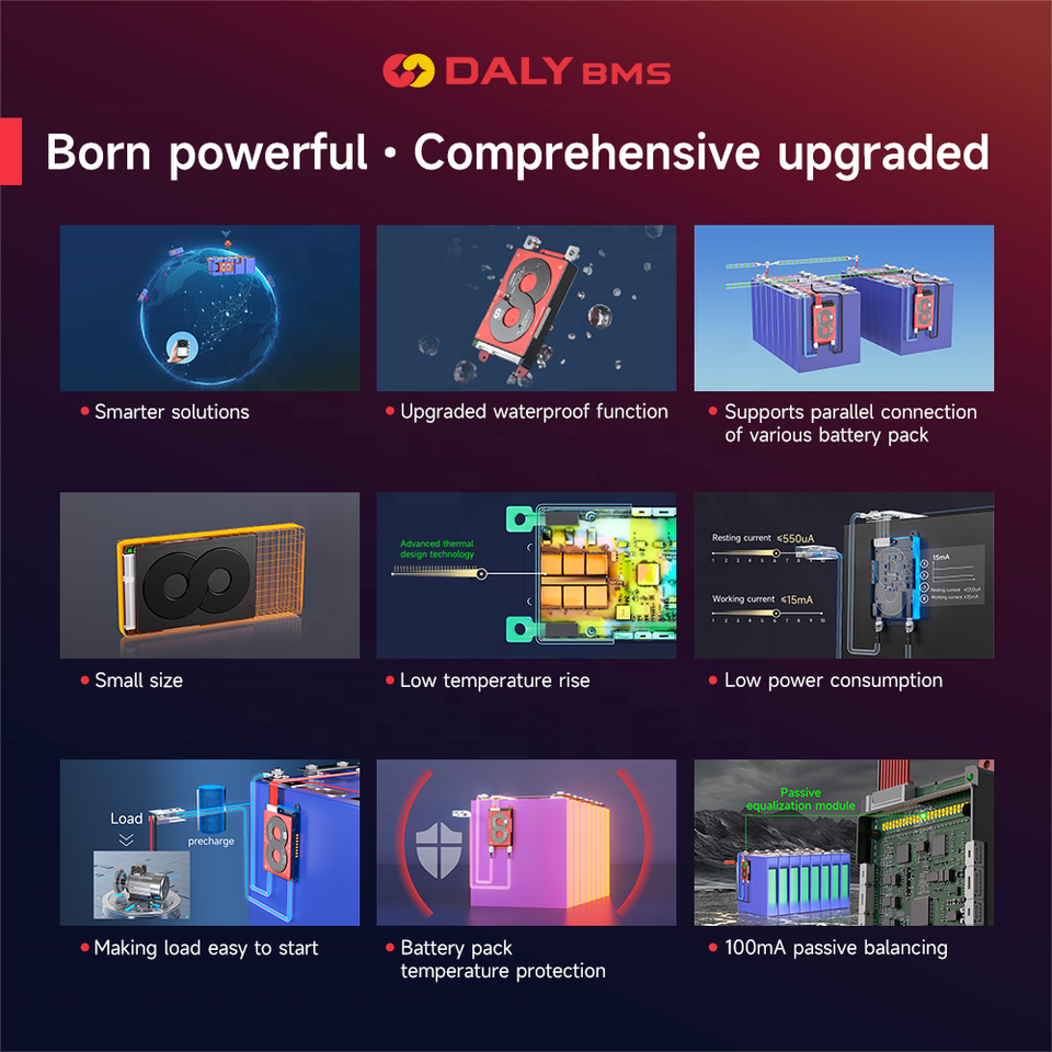BMS Inteligente Daly para Patinetes Eléctricos, Paquete de Baterías de Litio LiFePO4 Li-ion 3S 4S 8S 16S 17S 24S 12V 24V 48V 60V 72V 40A 60A 100A