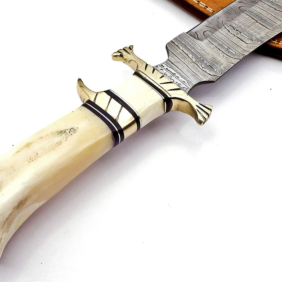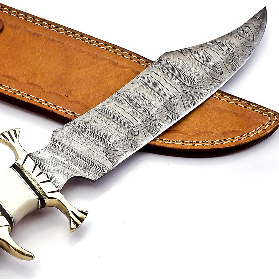 Cuchillo de Caza de Acero con Patrón Damasco y Funda de Cuero, Herramienta Utilitaria Hecha a Mano para Actividades al Aire Libre, Bushcraft y Camping