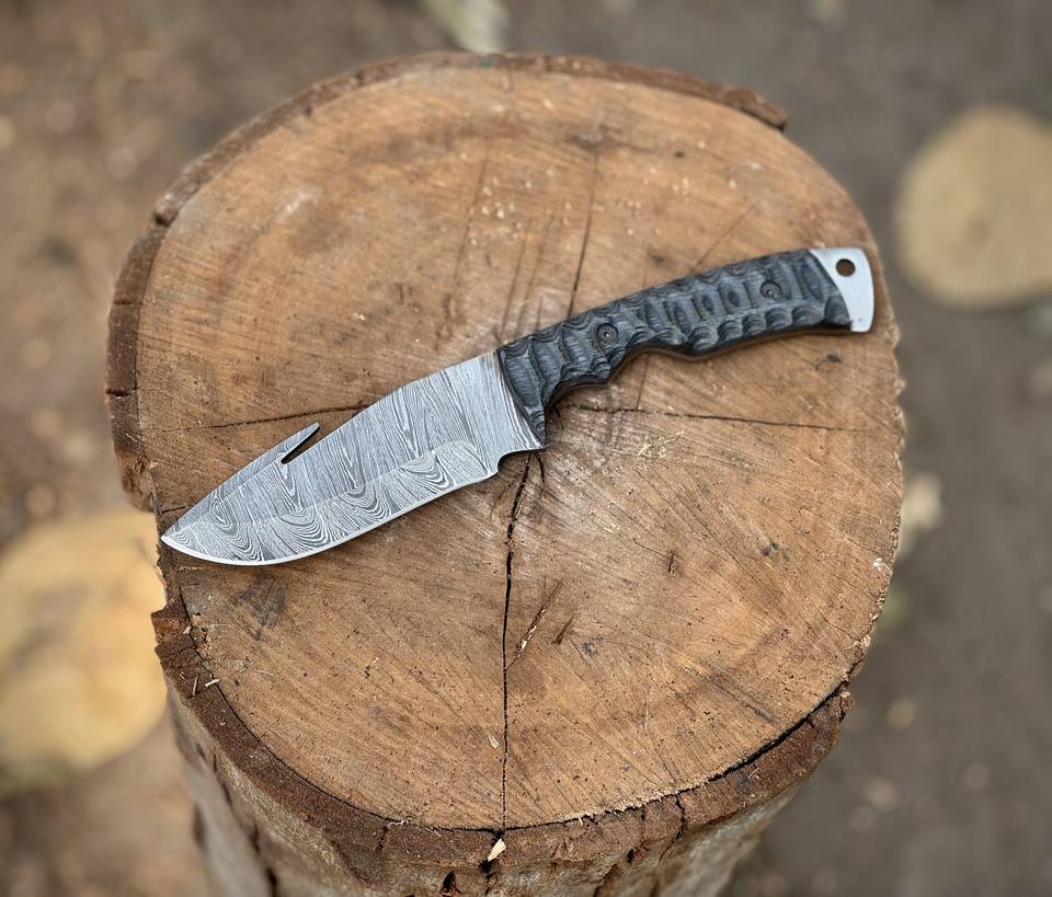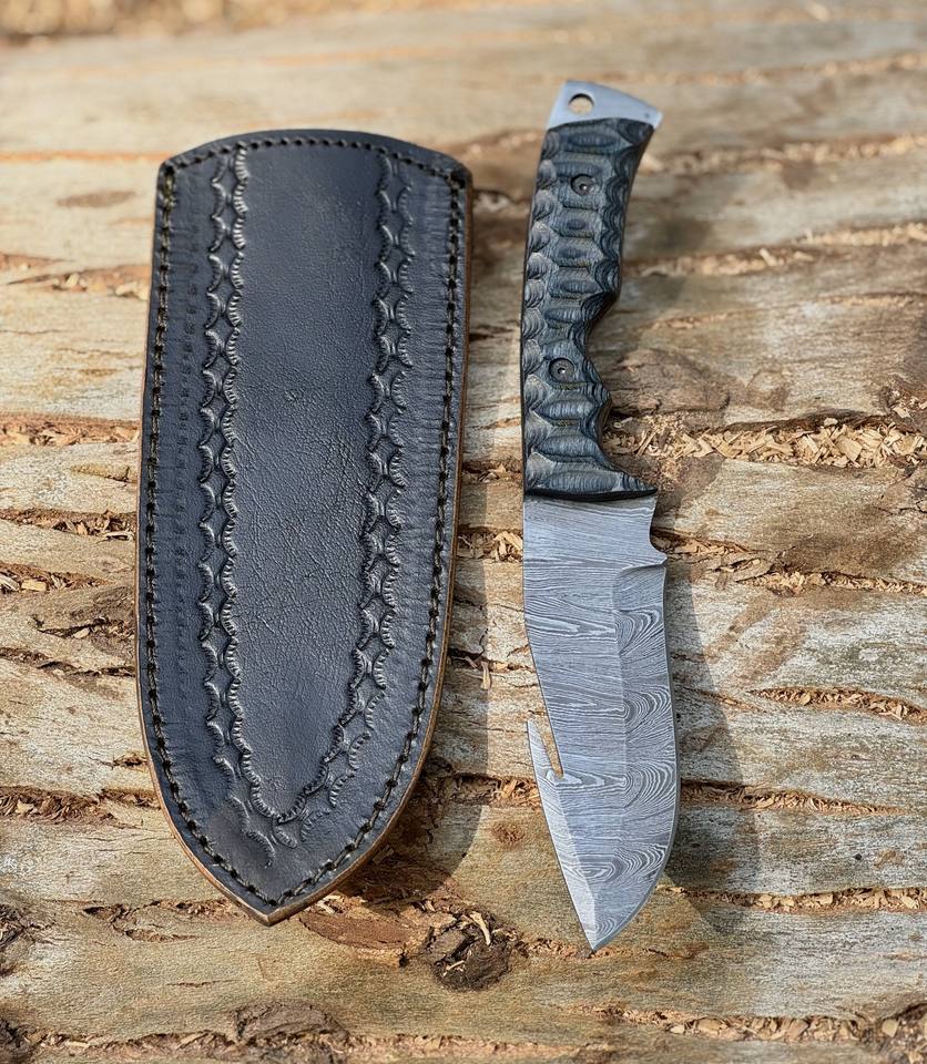 Cuchillo de Caza de Acero de Damasco con Hoja Fija y Gancho para Desollar, Cuchillo de Supervivencia para Camping y Actividades al Aire Libre con Funda Vertical