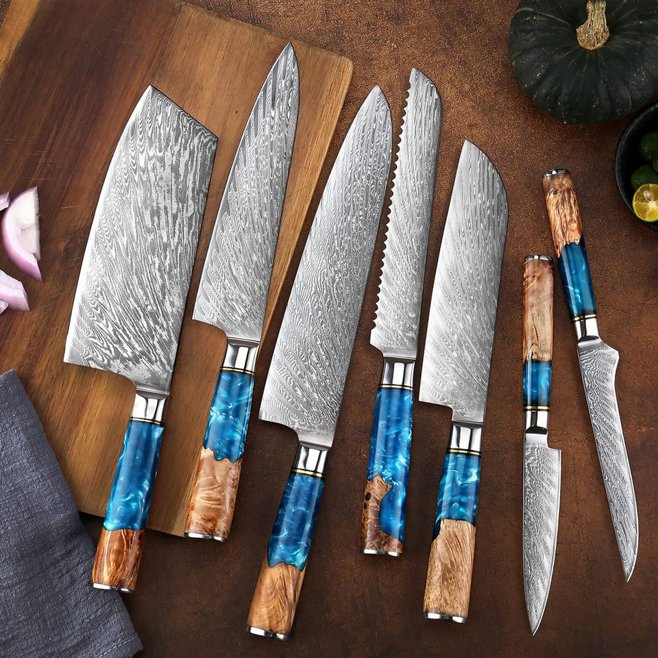 Juego de cuchillos de cocina de acero de Damasco, colección completa de cuchillos de cocina con un elegante diseño de mango para uso en cocina y restaurante.