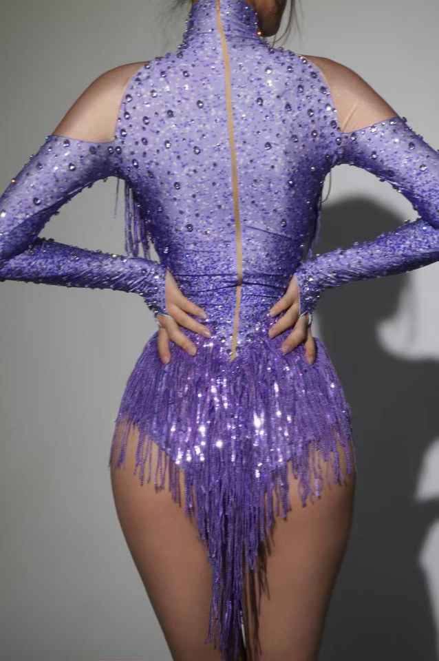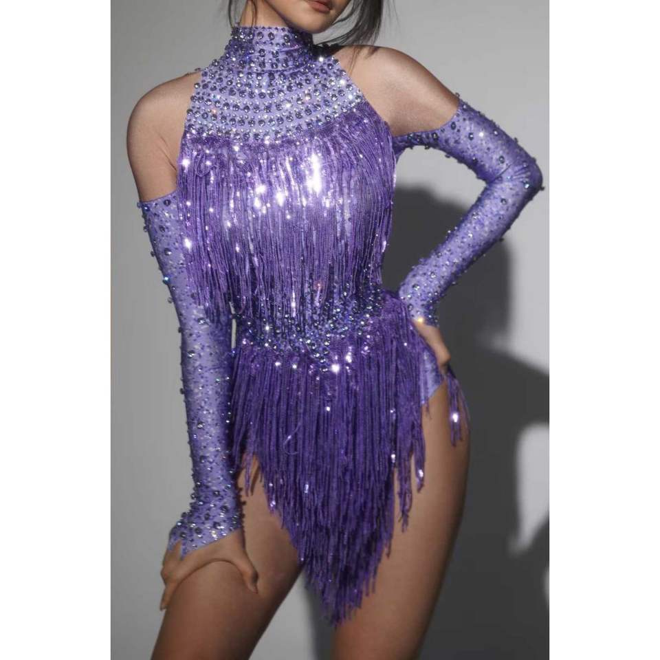 Trajes de Baile, Mono de Lentejuelas con Flecos para Actuaciones, Club Nocturno, Fiesta, Manga Larga, con Pedrería, para Mujer