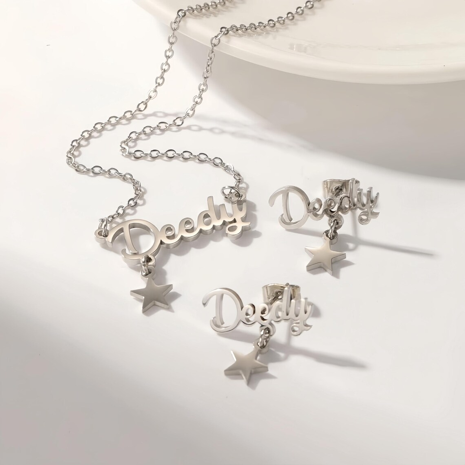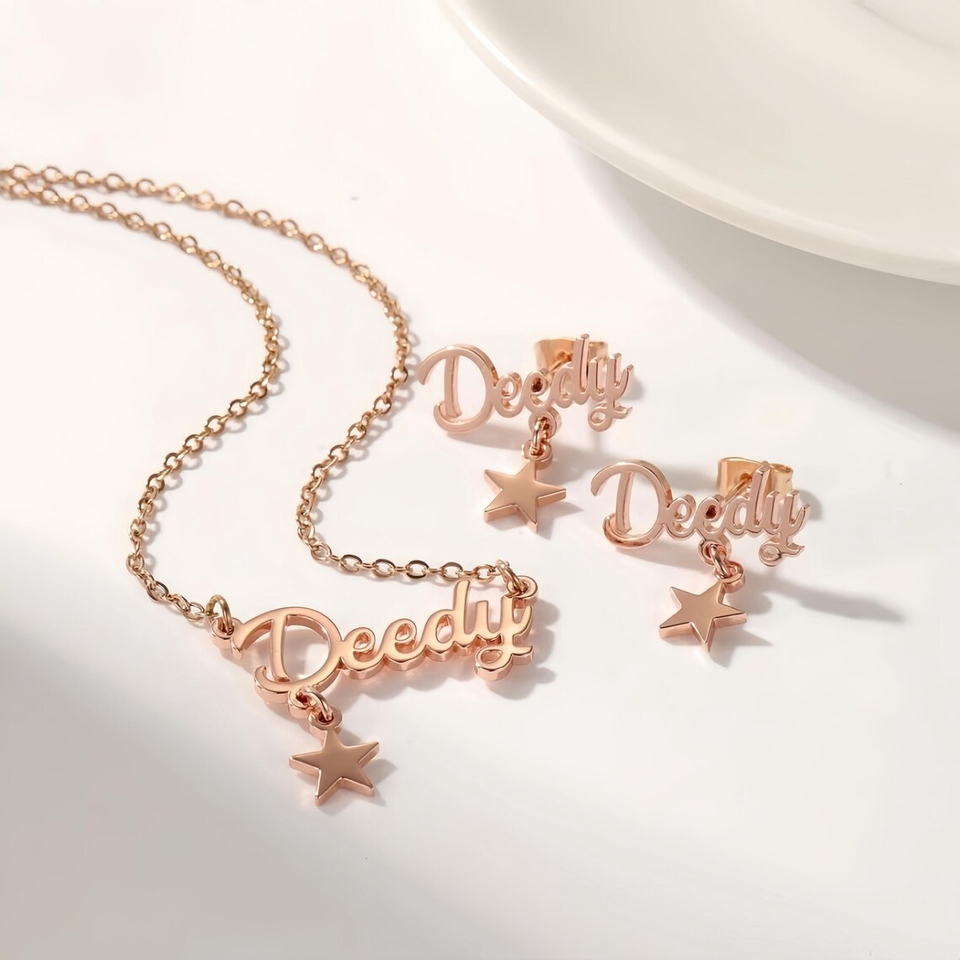 Conjunto de Collar y Pendientes con Mini Colgante Personalizado con Nombre y Forma, con Colgante de Estrella, Chapado en Oro, Antideslustre, para Mujer