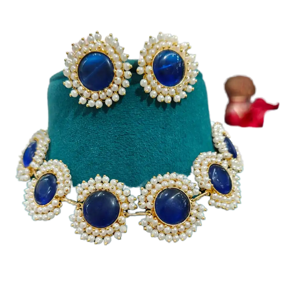 Conjunto de Gargantilla de collar de latón AD de tendencia azul oscuro con cadena de hebra de perlas estilo etéreo para boda y fiesta de mujer