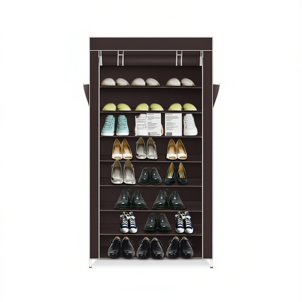 Zapatero de 10 niveles color marrón oscuro con cubierta antipolvo, organizador de almacenamiento independiente para uso en el armario del hogar.