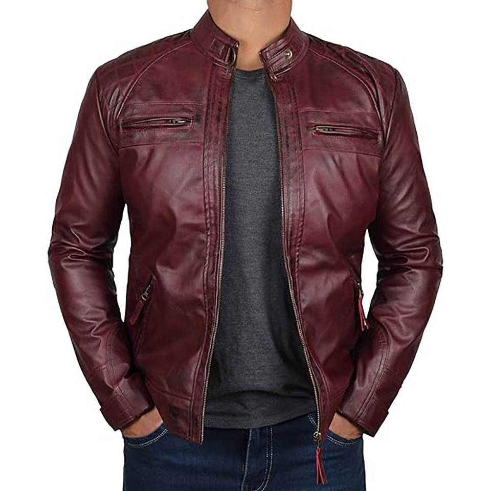 Chaqueta de Motociclista de Cuero Marrón Oscuro con Bolsillos con Cremallera, Chaqueta de Cuero de Cordero Auténtico, Chaqueta Marrón Informal para Hombre