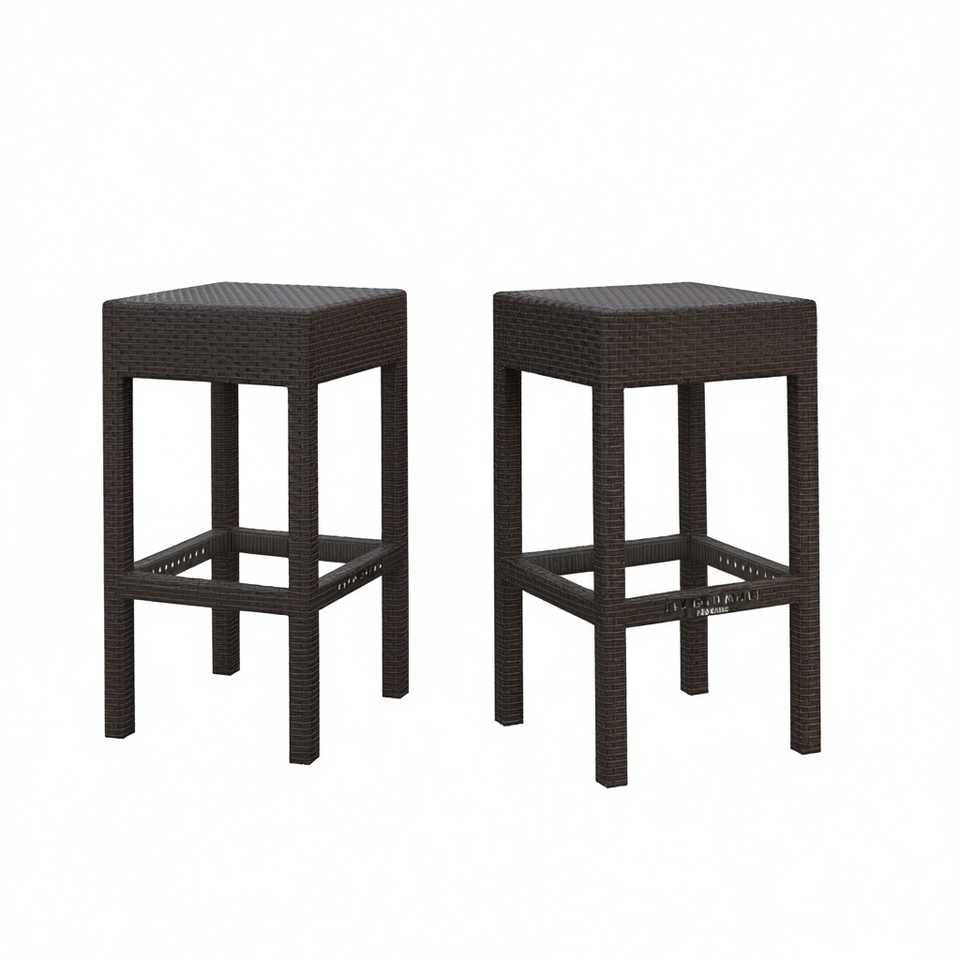 Juego de 2 taburetes de bar sin respaldo de ratán para exteriores, color marrón oscuro, muebles de bar modernos y contemporáneos con estructura de plástico