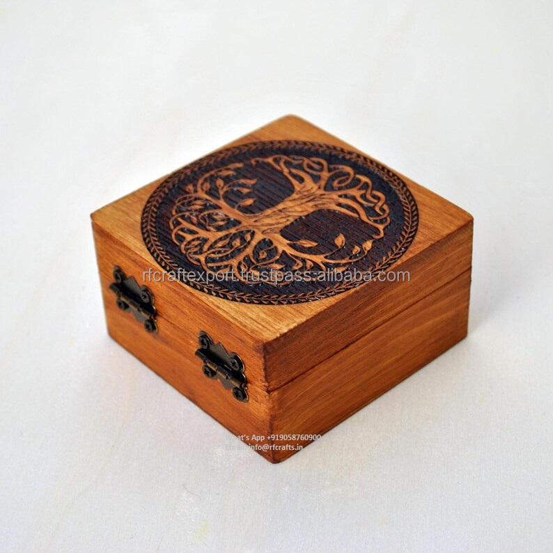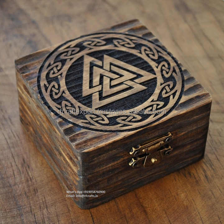 Caja de joyería de arte vikingo Valknut de estilo rústico marrón oscuro tallada a mano madera de teca mitología nórdica carteles de pared cajas de madera