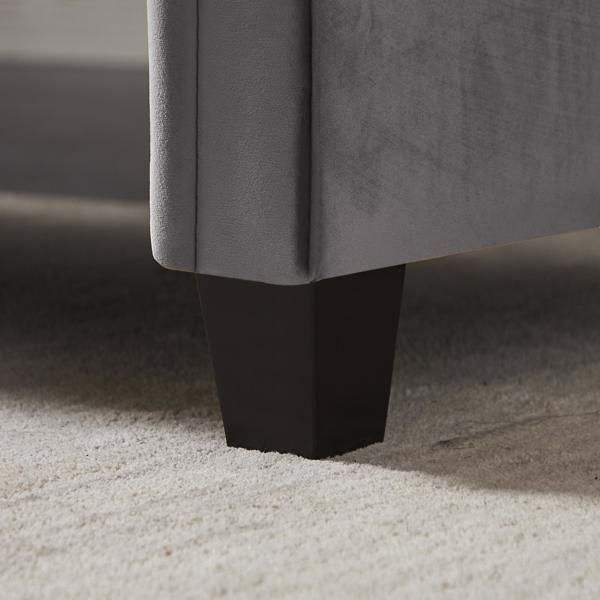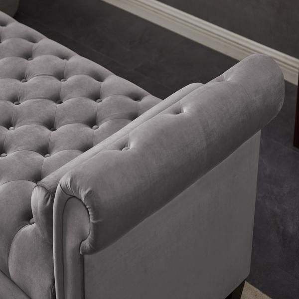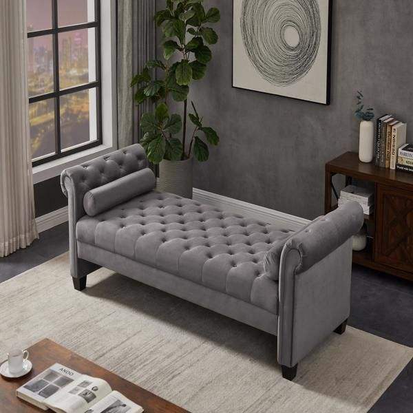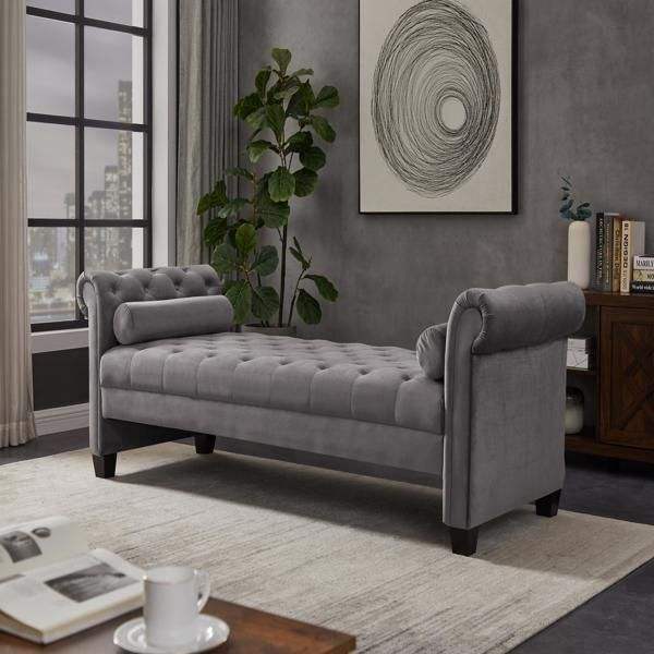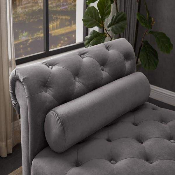 Sofá rectangular de terciopelo gris oscuro con patas de madera maciza y cojines cilíndricos adjuntos, muebles para sala de estar