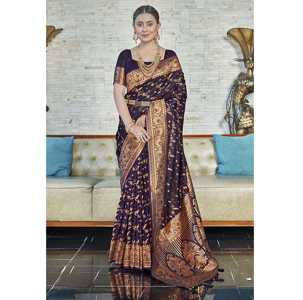 Saree de seda oscuro Magenta Banarasi Katan con patrón de Jaal intrincado y tejido de Zari opulento para una declaración audaz y elegante