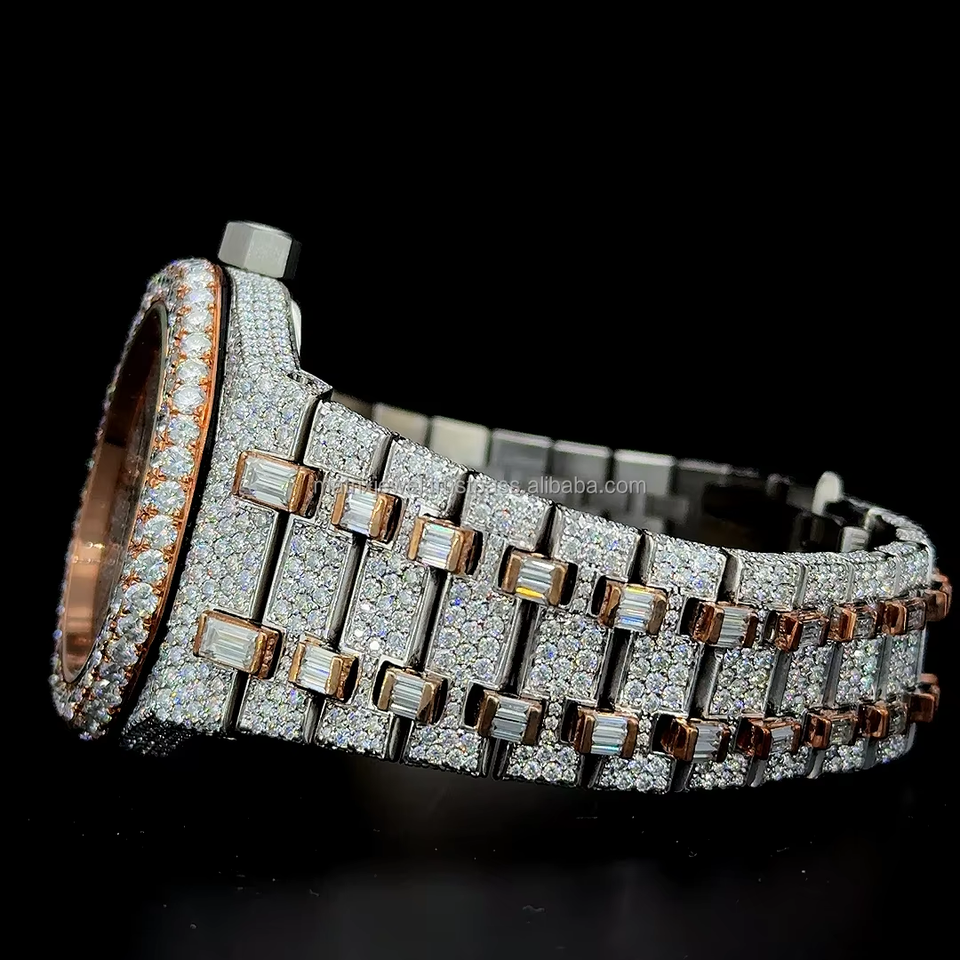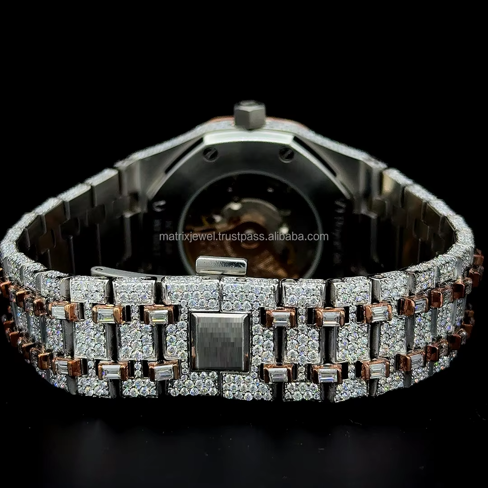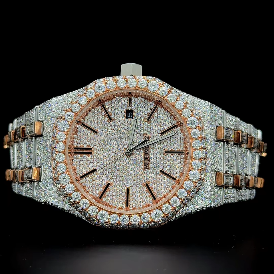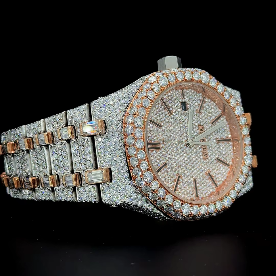 Reloj Automático con Números con Rayas, Dos Tonos en Oro Rosa, Completamente Cubierto de Diamantes Moissanite VVS de 27.5 Quilates