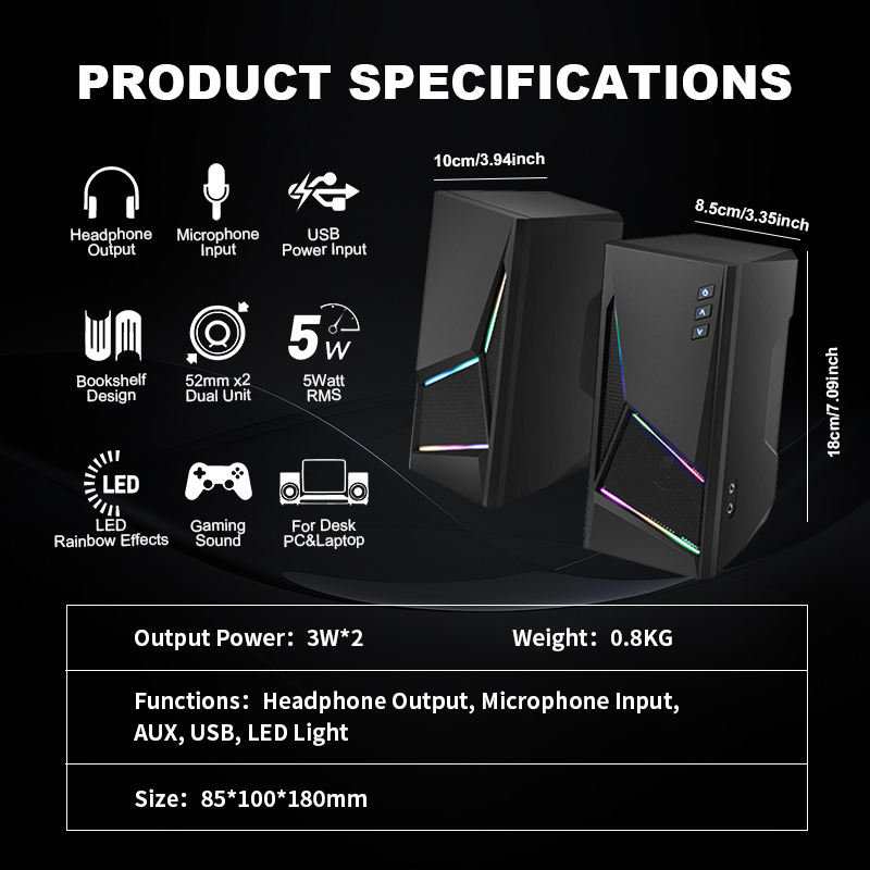 Dazzle Colorful Light LED 2,0 USB PC Altavoces Potente Bass Music Subwoofer RGB Escritorio Inalámbrico Home Computer Speaker para Gamer