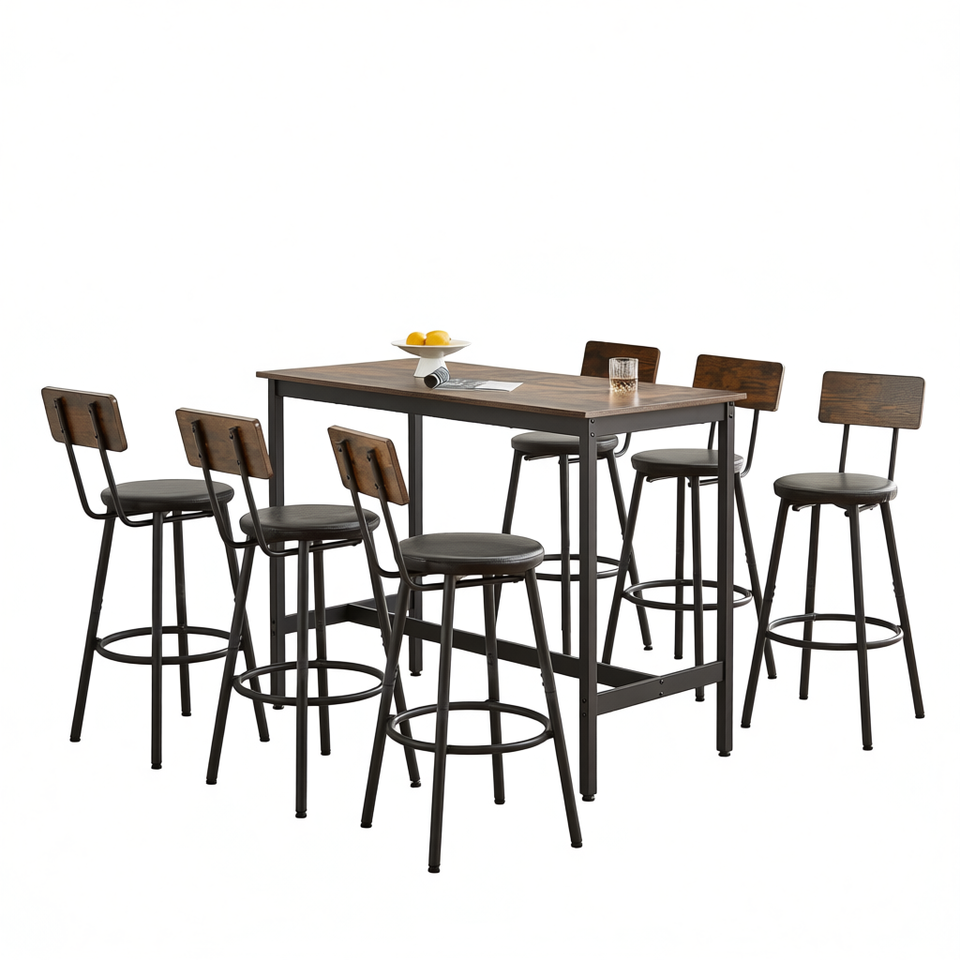 Juego de mesa alta Db Pub de 7 piezas, muebles de bar industriales, estructura rectangular de metal, sillas de cuero PU para el hogar y la cocina