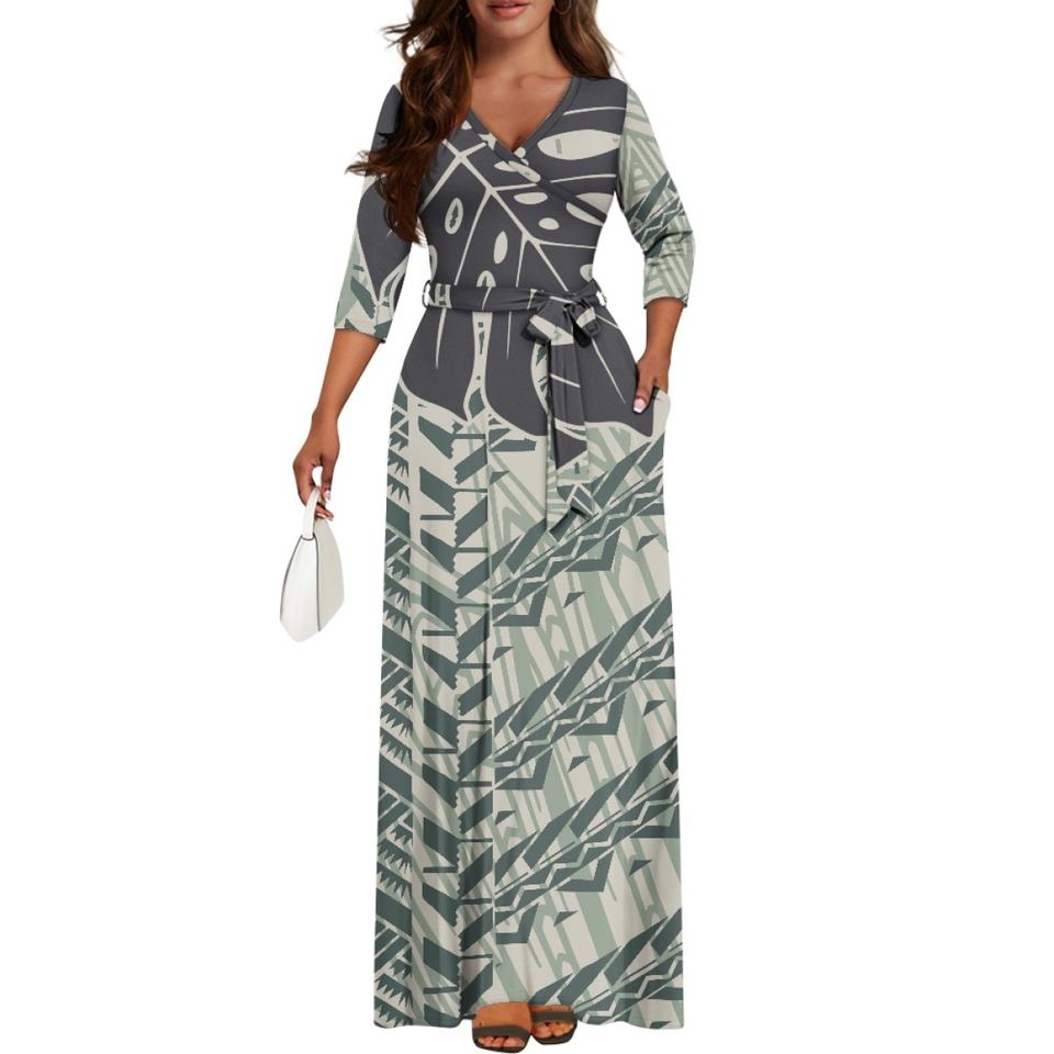 Dear Polynesian Tribe personalizado gran oferta flor verde manga larga cuello en V hueco mujeres Casual elegante vestido Hawaiano estampado a pedido