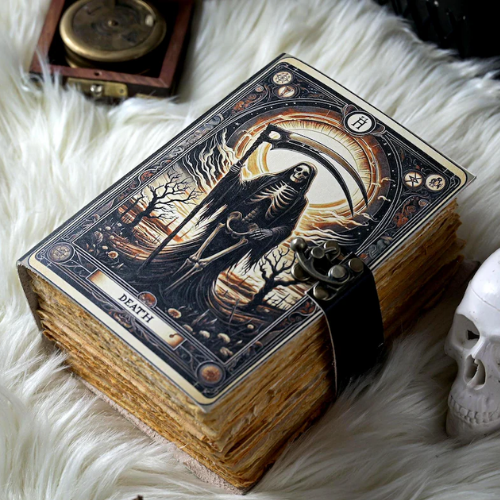 Nombre del producto:Muerte Tarot gótico Diario de cuero Grimoire hecho a mano con páginas Deckle