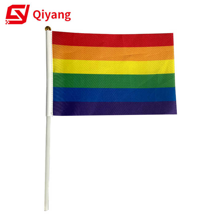 Banderas de diseño de decoración Venta caliente Orgullo de arco iris integral Gay en palo con poste 14*21cm Bandera de mano