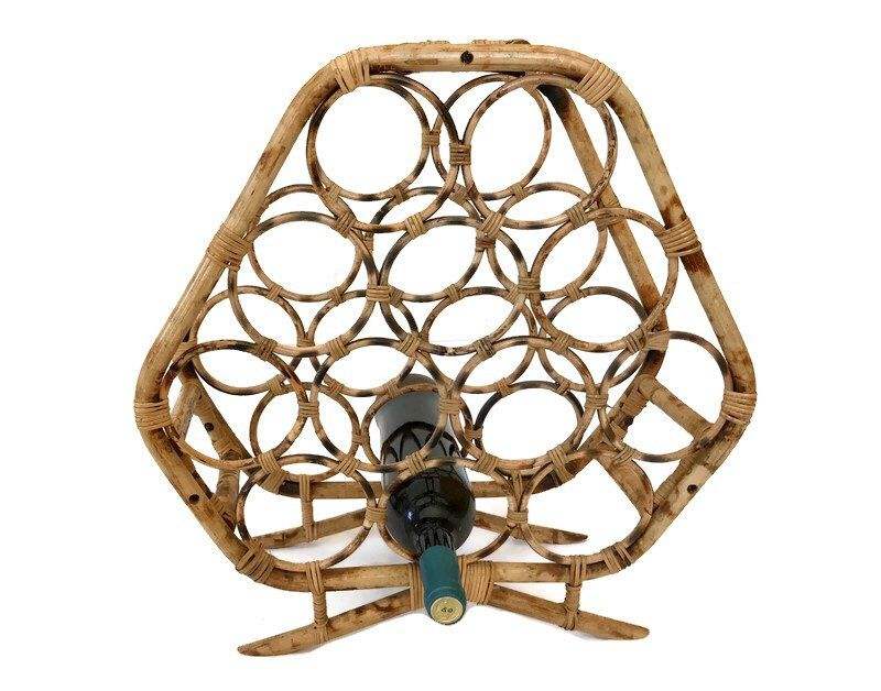 Estante decorativo para botellas hecho de ratán para un estilo rústico en el comedor y uso funcional diario.
