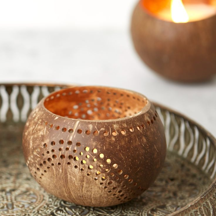 Candelero decorativo de cáscara de coco, candelabro ecológico hecho a mano para iluminación ambiental | Exportación sostenible de Vietnam