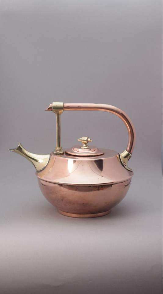 Tetera decorativa de cobre para servir té y presentación elegante en la mesa con detalles metálicos hechos a mano.