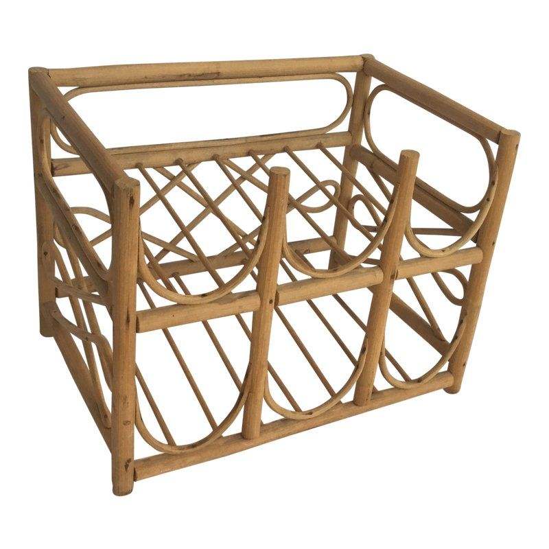 Estante decorativo de ratán para encimera, ideal para exhibir botellas de vino con encanto y textura natural.