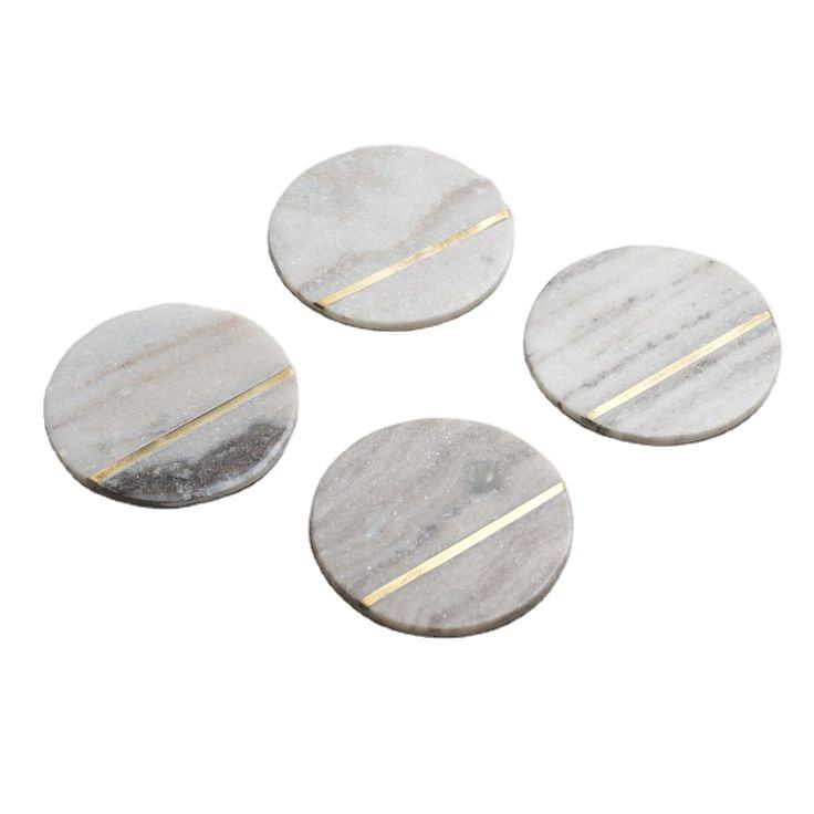 Posavasos de pizarra de piedra blanca natural Posavasos redondo de mármol decorativo con tiras de metal antideslizantes Accesorios de cocina Estera y almohadillas