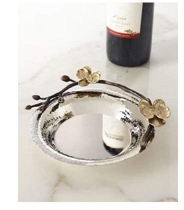 Bandeja metálica decorativa con mango dorado