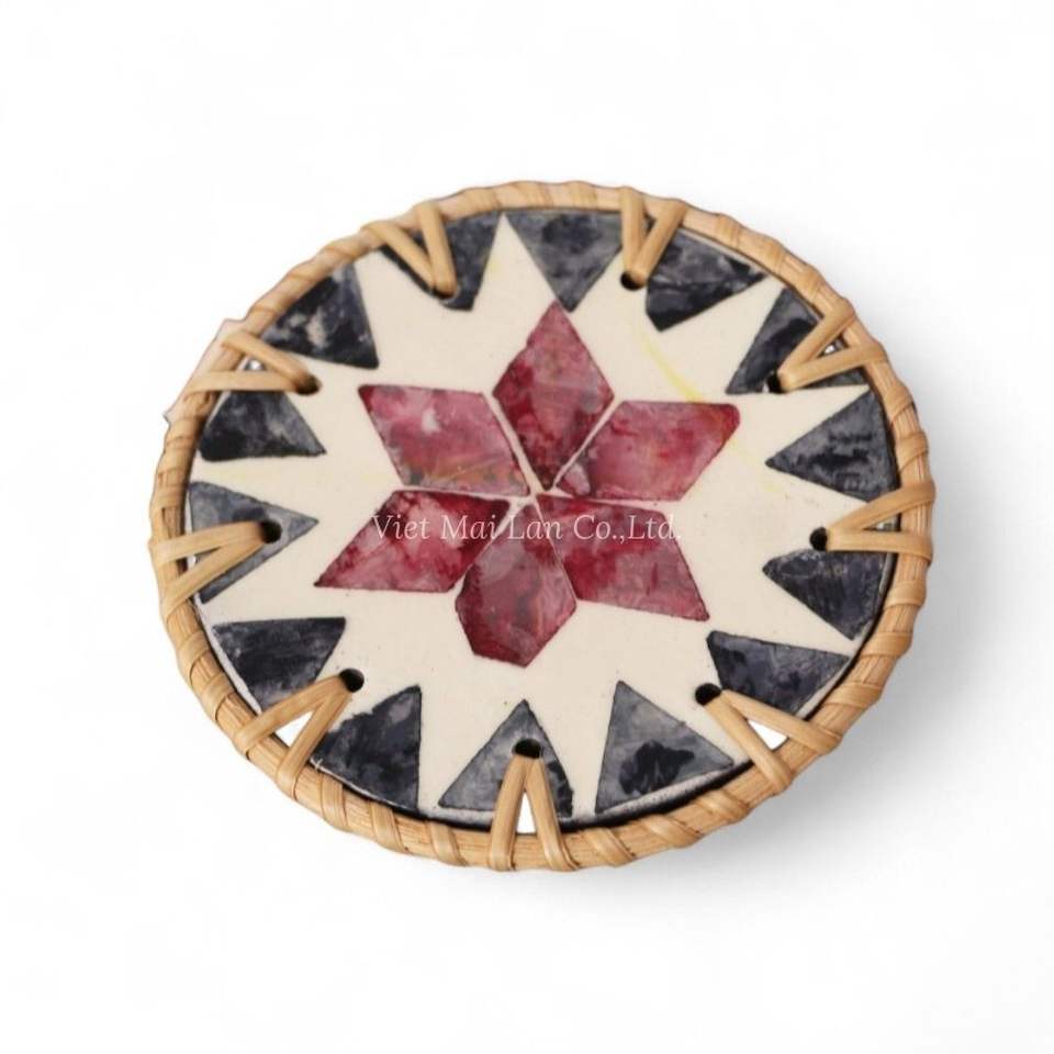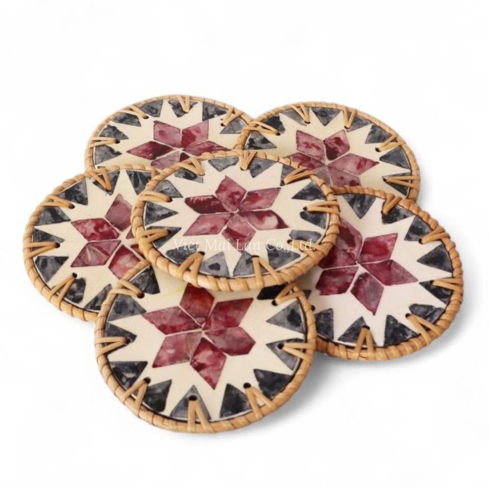 Posavasos Decorativo de Nácar con Borde de Ratán Natural para Uso Diario y Decoración Elegante del Hogar