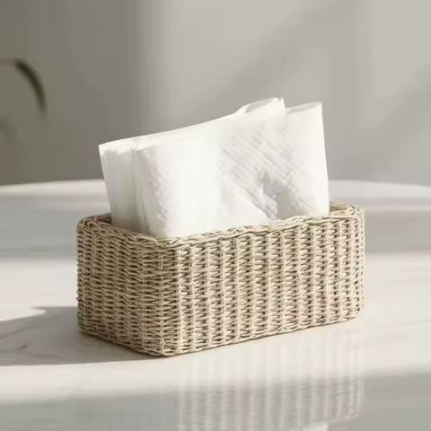 Caja de pañuelos decorativa de ratán natural con elegante diseño tejido, perfecta para usar en el baño o sobre la encimera del tocador.