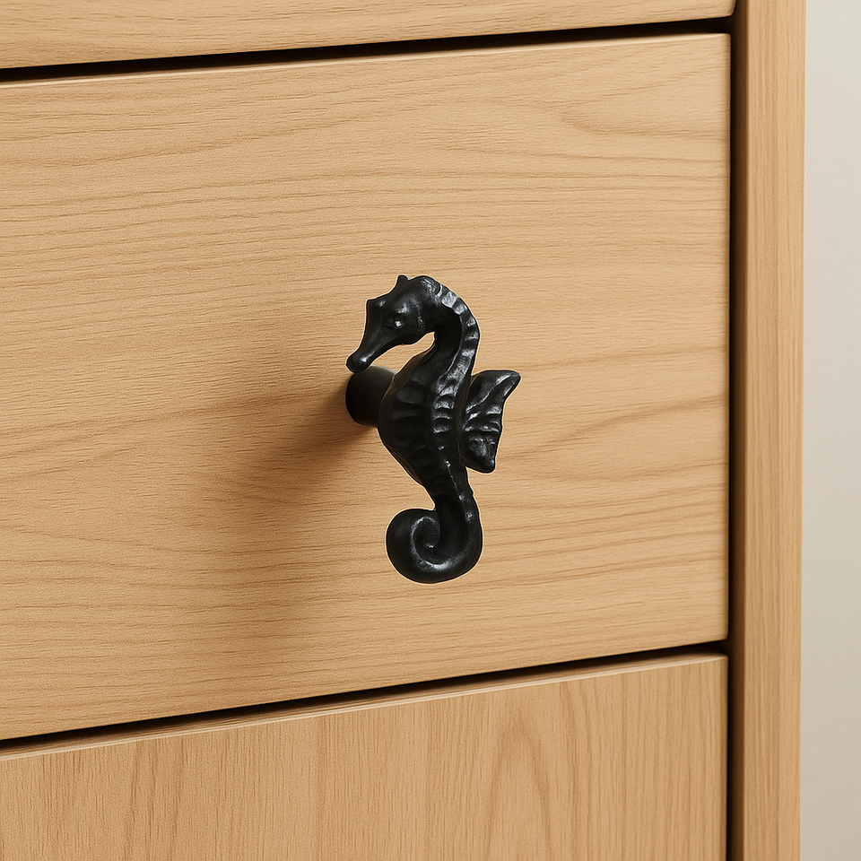 Pomo de hierro decorativo náutico caballito de mar recubierto de polvo negro tirador de cajón de gabinete manija de muebles rústicos herrajes costeros