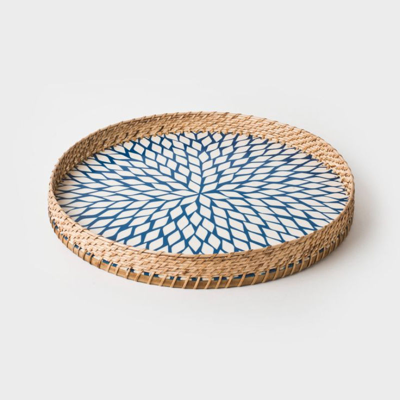 Bandeja redonda decorativa de ratán con acento de mármol Estilo moderno elegante hecho a mano Ideal para servir bebidas Aperitivos y exhibición