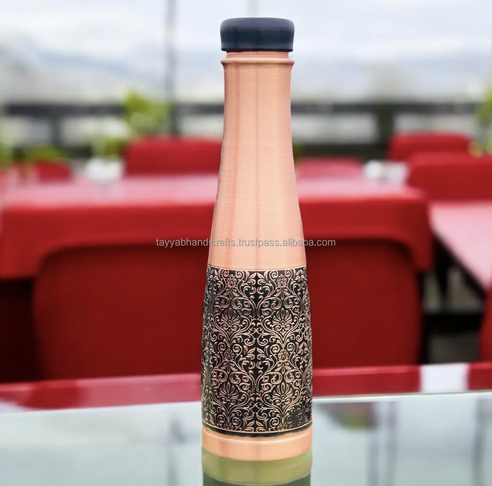 Botella de cobre decorativa con patrones únicos y beneficios de metal curativo ideal para regalos de bienestar o configuraciones holísticas