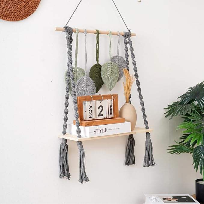 Estante colgante decorativo de macramé con flecos y tablero de madera, ideal para mostrar suculentas o coleccionables de inspiración Boho