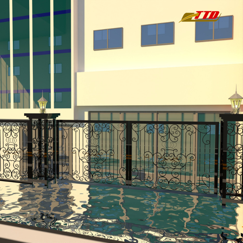 Puerta decorativa de entrada de hierro forjado con diseño superior curvo clásico, perfecta para fincas, villas o casas tradicionales